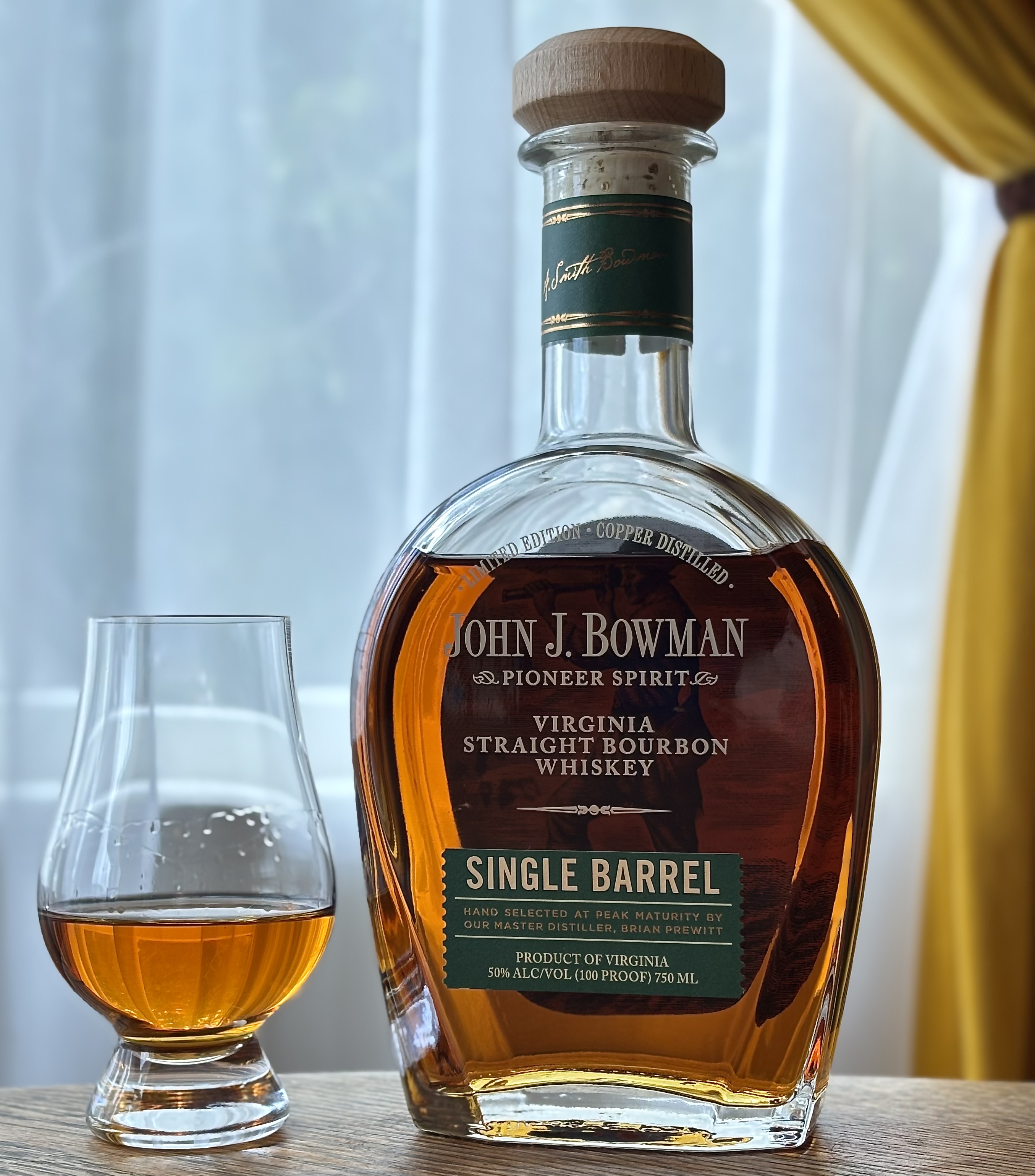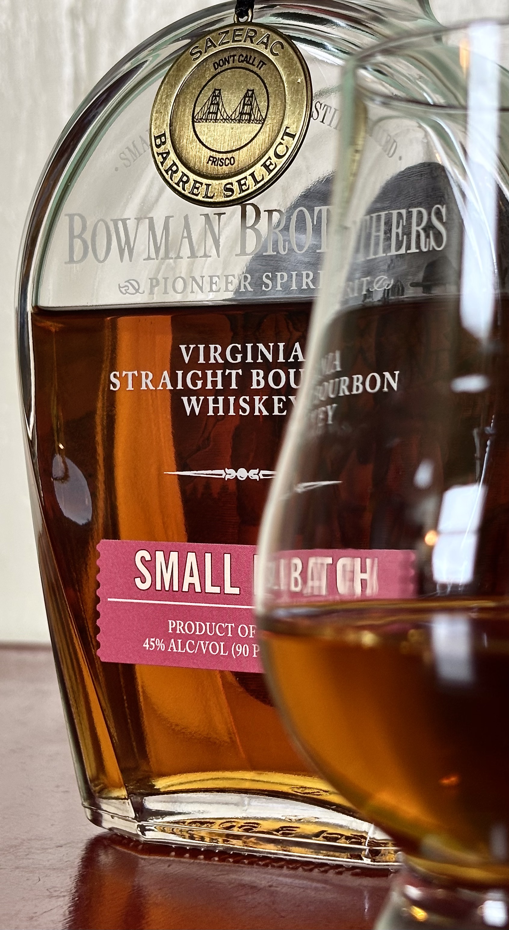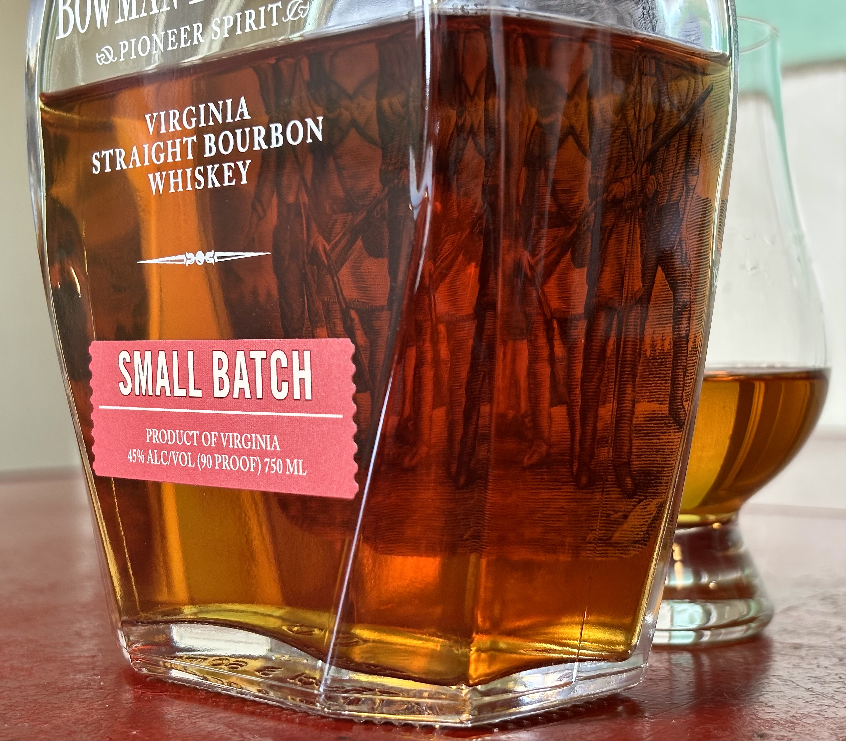 In the case of the current bottle on the table, “Small Batch” and “Single Barrel” come together to underscore the wiggliness of the terms. “Bowman Brothers Pioneer Spirit Small Batch” is the name of the brand extension, yet this bottling is of a “single barrel” of what would normally be batched into a larger “small batch” release. So although the terms would seem to stand in direct contradiction, here they don’t.